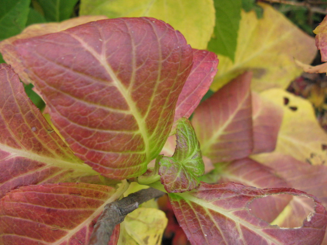 アジサイの葉も赤や紫に色づいてきました。