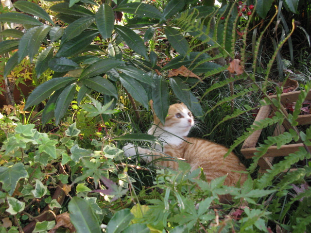 わが家のにゃぁこは三毛と茶トラ率が高いので、秋の庭によくとけ込みます。